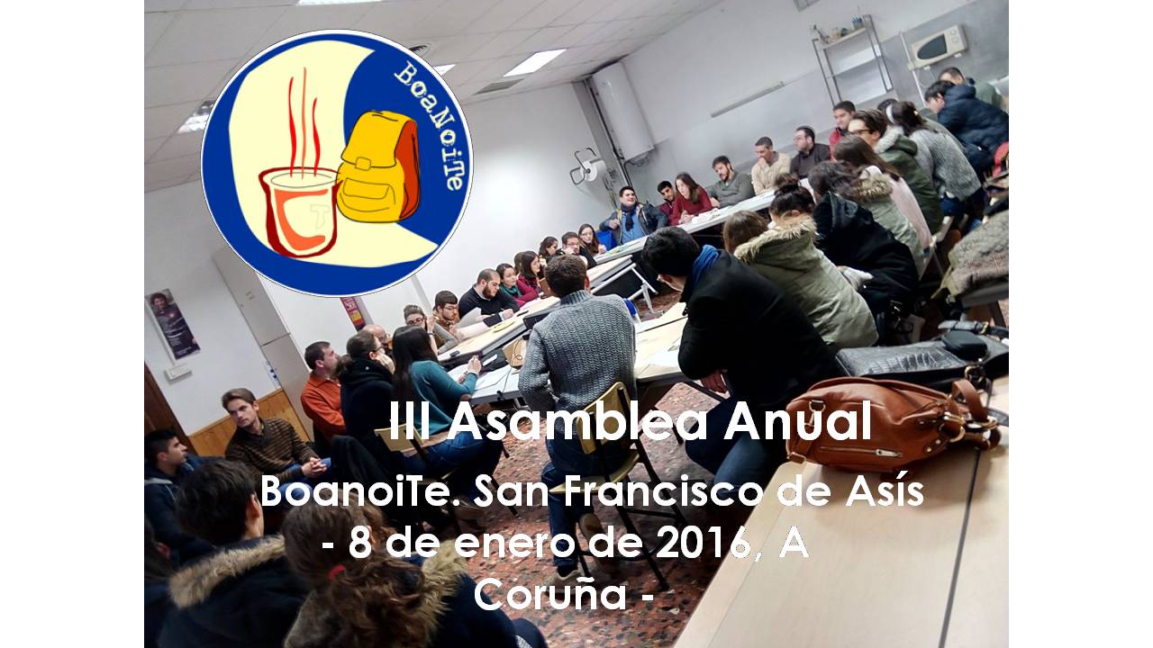El pasado viernes 8 de Enero tuvo lugar la Asamblea anual de BoanoiTe, este año con la participación estelar de BoanoiTe-Santiago, en la que hicimos una presentación resumen de todos los proyectos que se llevan a cabo desde la Asociación, y pusimos la información al día sobre la situación interna y externa de este humilde grupo de jóvenes que ya es referencia en el mundo social de Coruña y Santiago. Y muy pronto en Vigo,